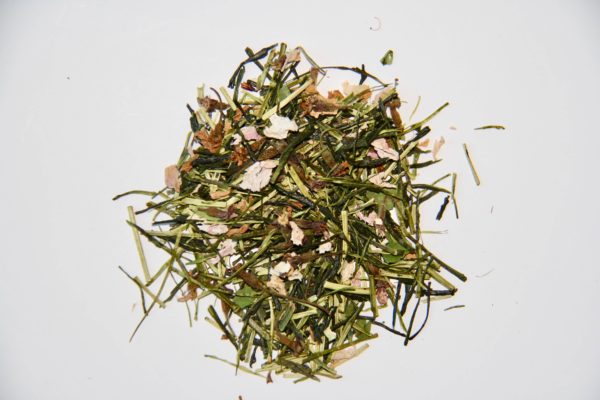 Ce kukicha (ou thé de tige) est cultivé organiquement dans la région du Mont-Fuji. Il vous révélera le véritable goût des pétales de fleurs de cerisier. Cela m’a évoqué un peu des notes d’amandes douces et sucrées. Aucun arôme n’a été ajouté içi. C’est bel et bien le contact prolongé des feuilles de thé avec les pétales de fleurs de cerisier, pendant le processus de fabrication, qui vont donner le parfum naturel et délicat. Les pétales de fleurs de cerisier ont été prélevées non loin de Fujieda dans la province de Shizuoka, là même ou poussent les théiers de la coopérative de M. Kine